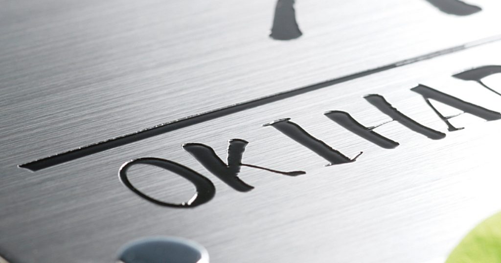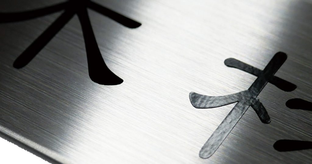 薬品で溶解した凹部に塗料を入れ焼き付け、文字やデザインを表現する技法で、多くはステンレス彫刻に使用します。 耐久性にも優れ、屋外の企業看板にも多く使用されています。